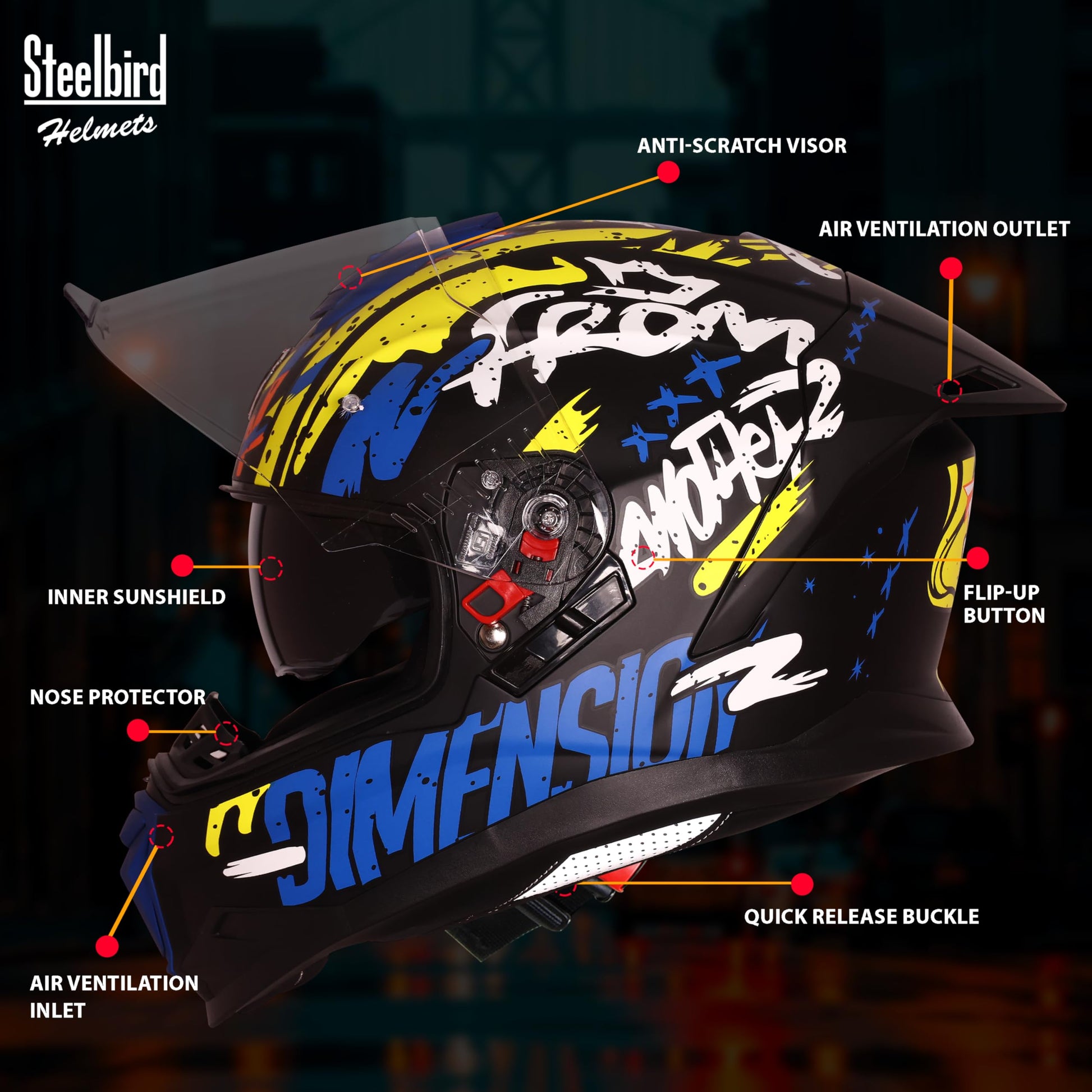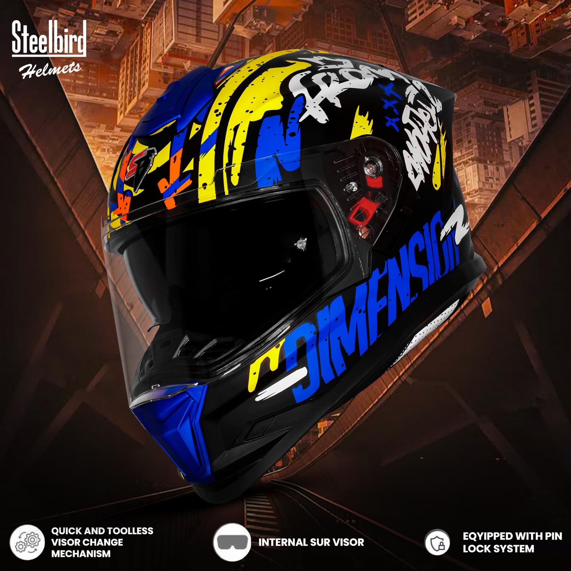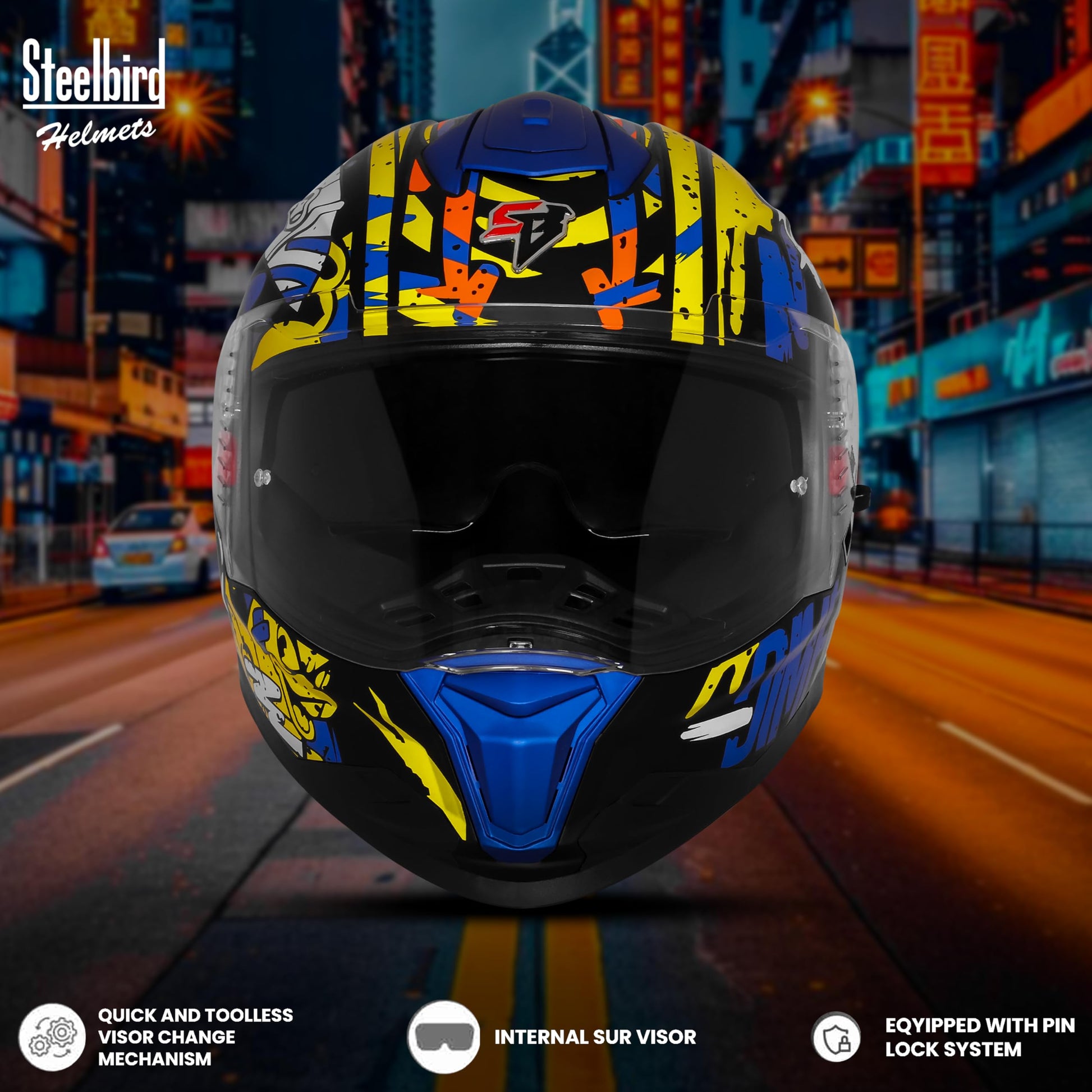Steelbird SBH-57 Fighter F10 Graphic Helmet ISI and DOT Certified Full Face Helmet for Men with Inner Silver Sun Shield (Glossy Black Blue White)