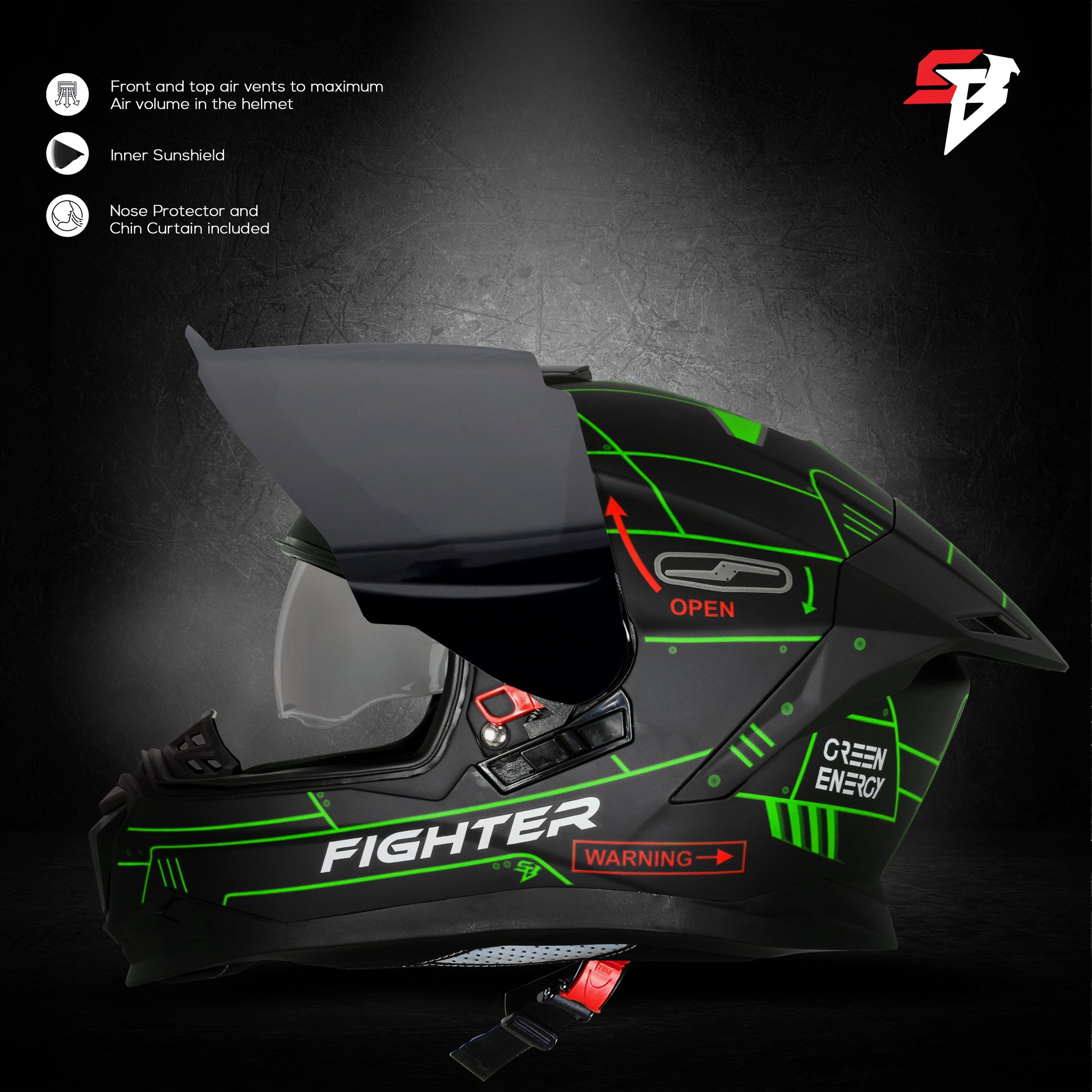 Steelbird SBH-57 Fighter F6 ISI and DOT Certified Full Face Graphic Helmet for Men and Women with Inner Silver Sun Shield (Glossy Black Green)