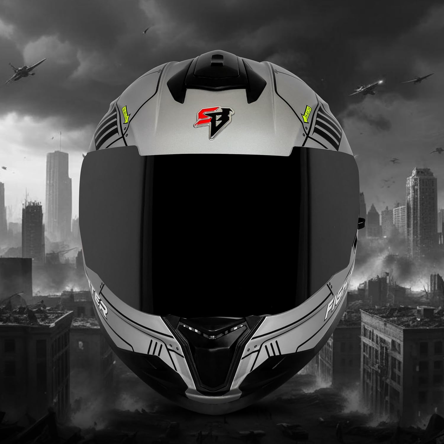 Steelbird SBH-57 Fighter F6 ISI and DOT Certified Full Face Helmet for Men and Women with Inner Silver Sun Shield (Glossy Silver Black)