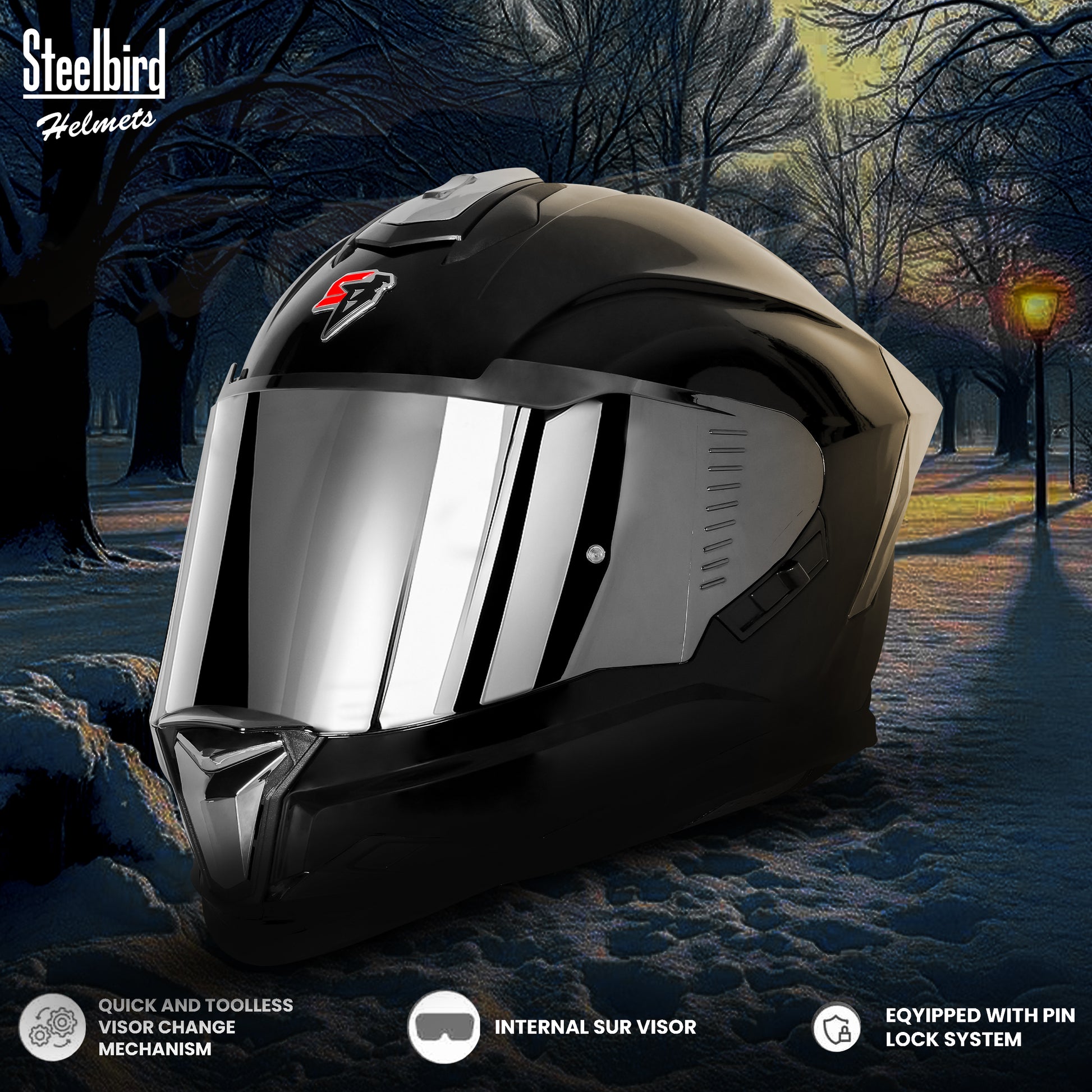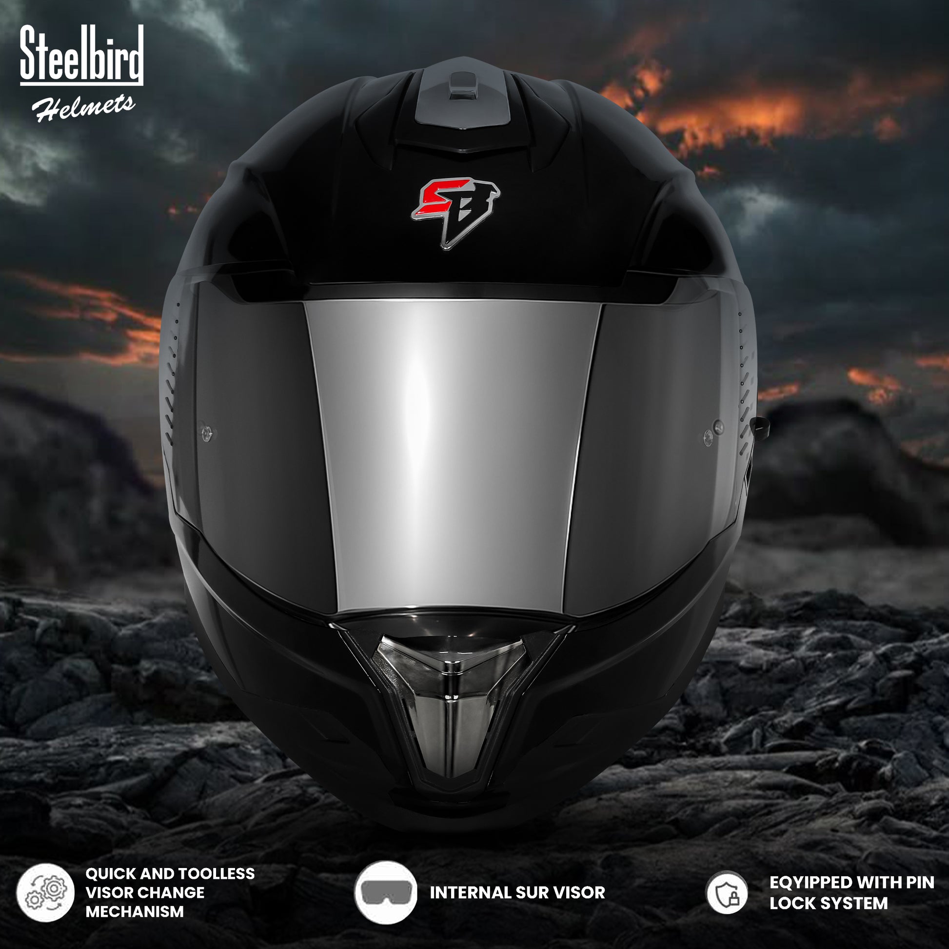 Steelbird SBH-57 Fighter F9 ISI and DOT Certified Full Face Helmet for Men and Women with Inner Silver Sun Shield and Silver Spoiler (Glossy Black)