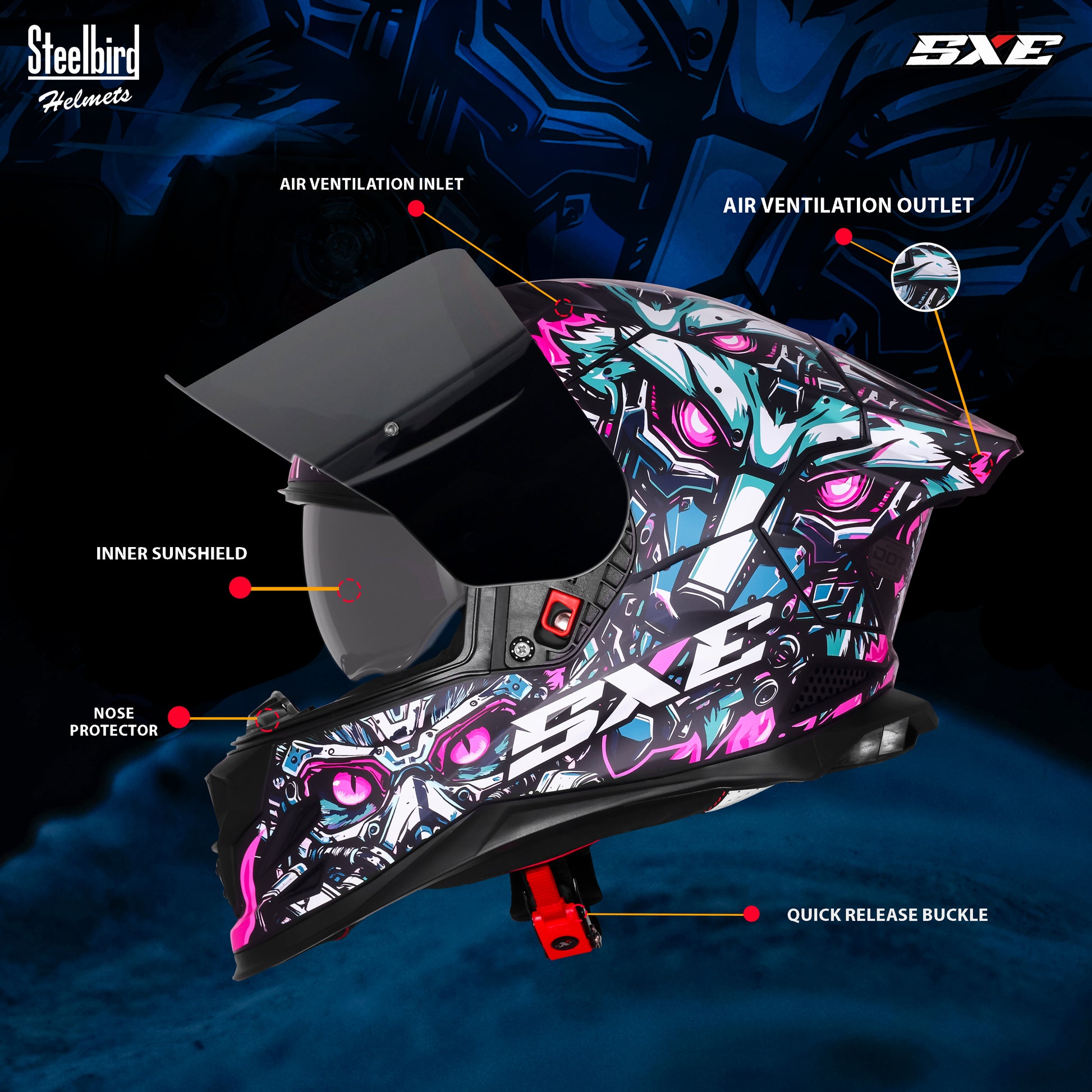 Quick release chinstrap mechanism for ease of operation and safety High quality UV resistant Polyurethane paints used for aesthetic enhancement Dynamic ventilation system for increased air flow providing more comfort to the rider while driving Outer shell injected from special high impact grade of engineering thermoplastic Regulated density EPS concussion padding lined with specially treated anti allergic velveteen. Helmet Fitted with Clear Visor.